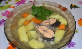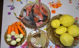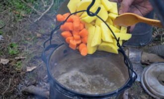 We dompelen aardappelen en wortelen in visbouillon. Kook ongeveer 30 minuten.