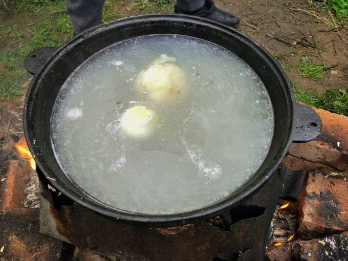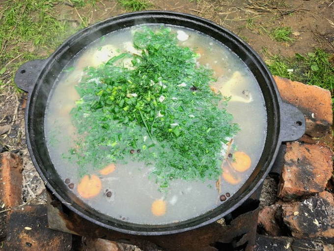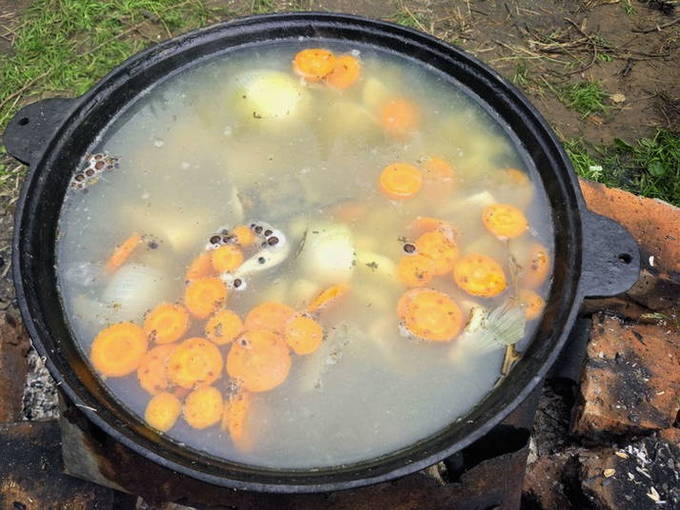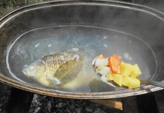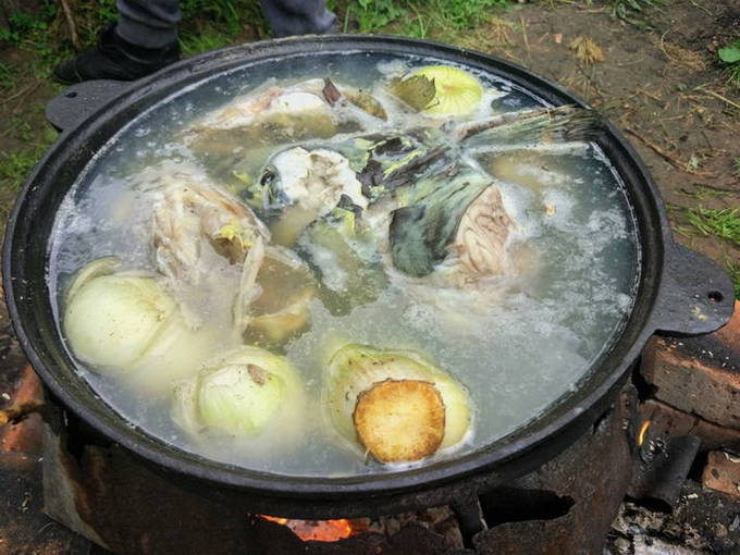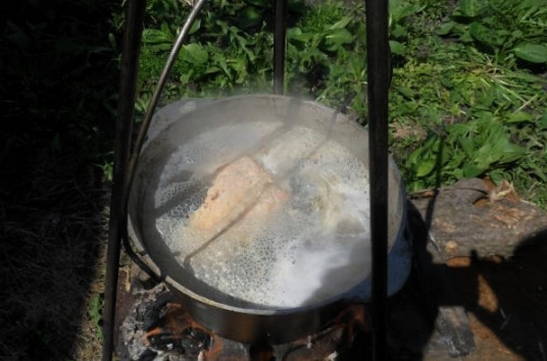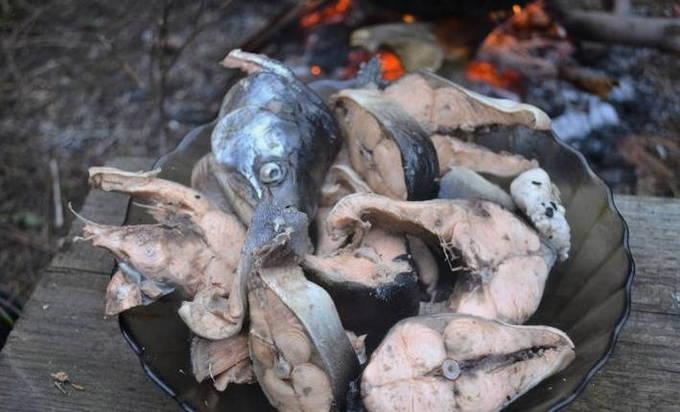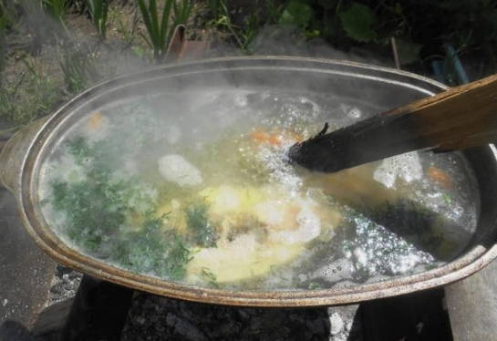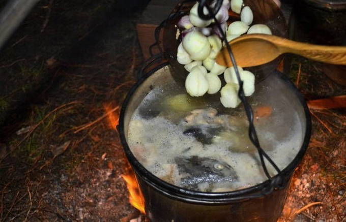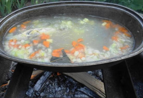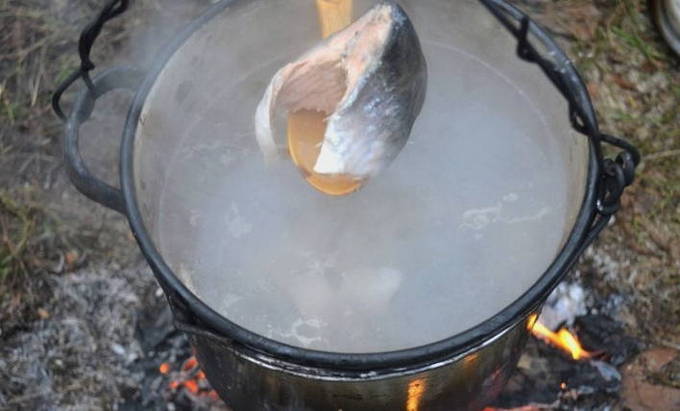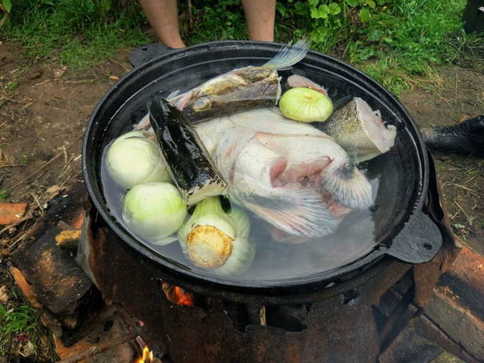 - We wassen de snoek onder water en snijden in kleine stukjes. De staart en kop kunnen worden verwijderd. We spreiden de vis in een ketel met water die in een kampvuur staat. We wachten op de kook.