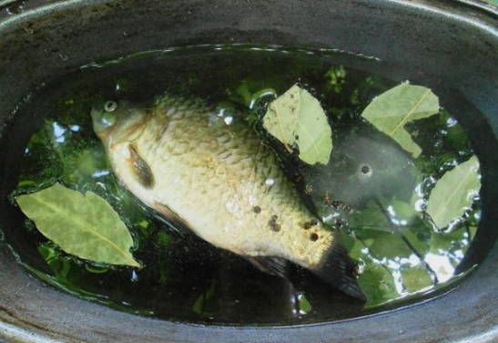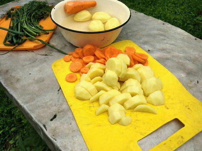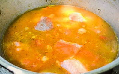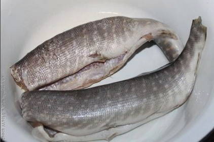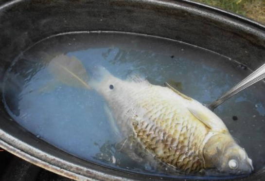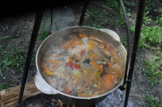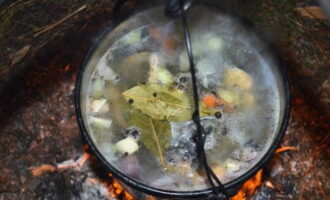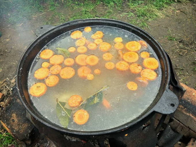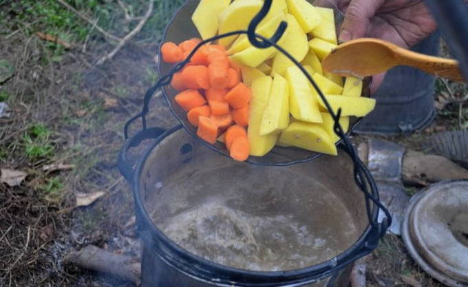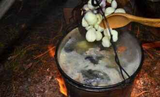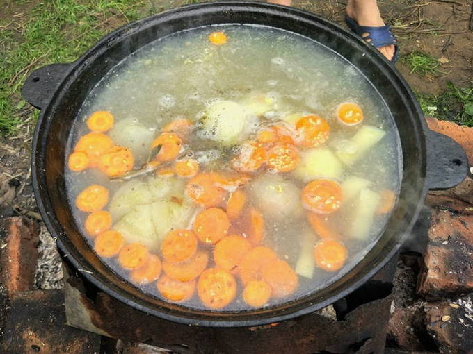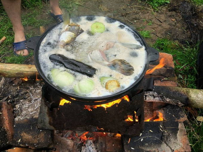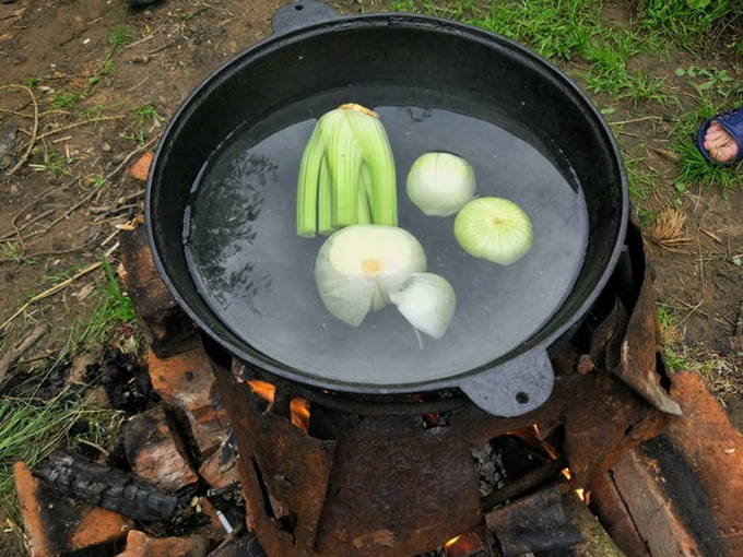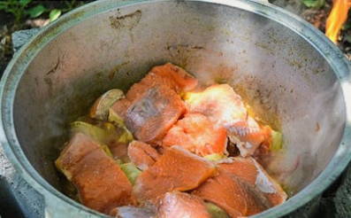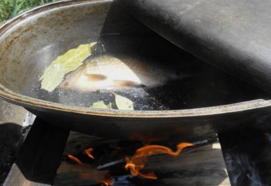 - We wassen de snoek onder water en snijden in kleine stukjes. De staart en kop kunnen worden verwijderd. We spreiden de vis in een ketel met water die in een kampvuur staat. We wachten op de kook.