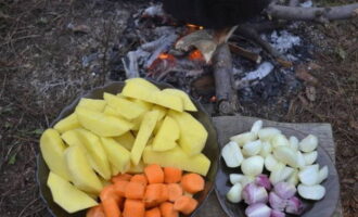We zullen de nodige producten klaarmaken. Schil en spoel de groenten. Snijd de forel in kleine stukjes.