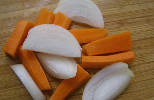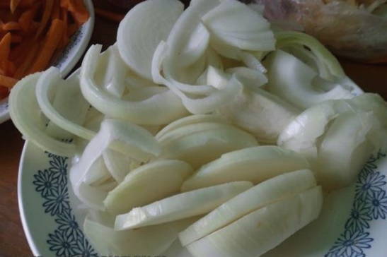 - Snijd de ui met wortelen op een handige manier.We dompelen groenten onder in visbouillon.
