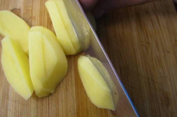 - Schil vervolgens de aardappelen en snijd ze in middelgrote plakjes.