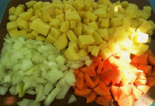 - Snijd de aardappelen, wortelen en uien in kleine blokjes.