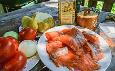 Boven een vuur kan een geurige en voedzame vissoep worden bereid van vissenkoppen. Voor zo'n gerecht kun je het beste een ruime ketel gebruiken. Serveer een levendige traktatie voor een zelfgemaakte maaltijd in de buitenlucht.