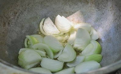 - We installeren de ketel boven het vuur en gieten er plantaardige olie in. Bak hier de stukjes ui.