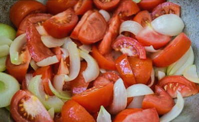 - Ook leggen we hier grote plakken tomaten.