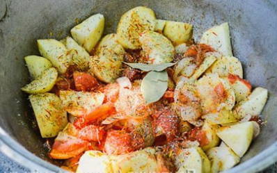 - Leg vervolgens de aardappelen neer. Bestrooi groenten met zout en kruiden. Roer en laat 10-15 minuten sudderen.