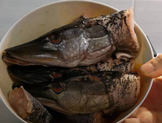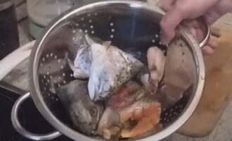 - Om vissoep te bereiden, hebben we snoekkoppen en -staarten nodig. Zowel verse als diepgevroren delen kunnen worden gebruikt. Ze moeten worden afgespoeld zodat er tijdens het koken minder schuim ontstaat.