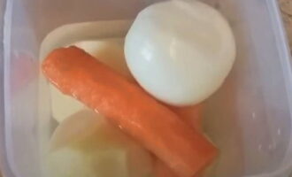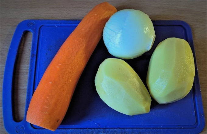 - Laten we nu verder gaan met de rest van de ingrediënten. Wij maken uien, wortelen en aardappelen schoon.