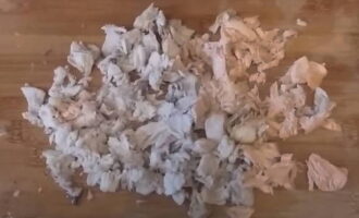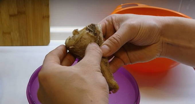 We scheiden het vlees van de gekookte koppen en sturen het ook naar een bijna klaar oor. We halen de kop van de ui eruit en gooien deze weg. We zullen het niet meer nodig hebben.