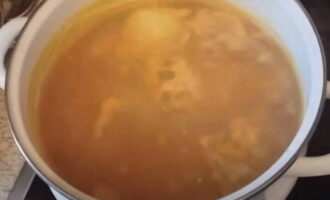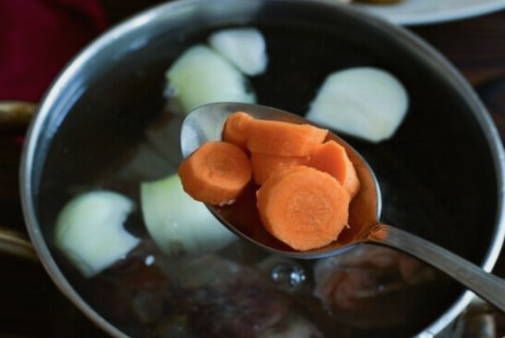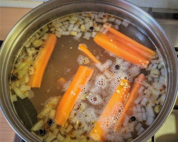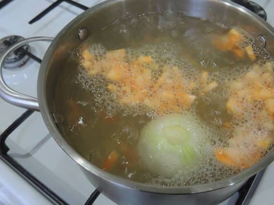 - Voeg de wortelen toe aan de bouillon en stuur dan de hele ui. We hebben het alleen nodig voor de duur van het koken. Daarna moet het worden weggegooid.