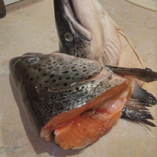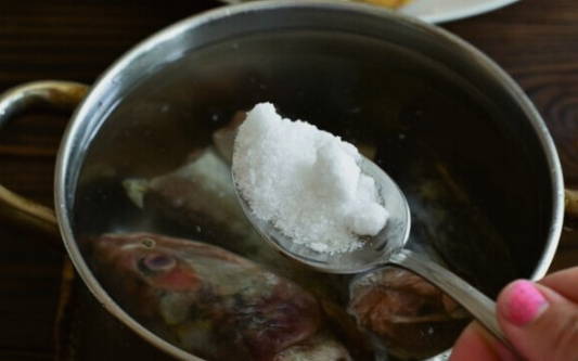 Laten we eerst de bouillon koken. Om dit te doen, doe je zwarte peper in kokend water, voeg een beetje zout toe en voorzichtig zodat het water niet spat, leg de viskoppen in de pan. Kook 20-30 minuten tot de forel gaar is.