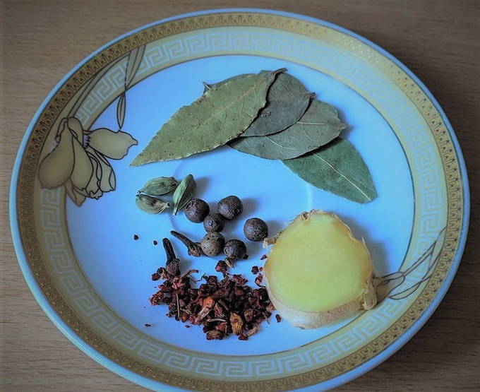 - We gaan meteen kruiden klaarmaken voor de toekomstige vissoep. U kunt uw favoriete toevoegingen als smaakmaker gebruiken. Ik heb het gember, droge adjika en traditionele kardemom, laurier en peperkorrels. Je kunt klassieke kruiden toevoegen of gewoon peper en zout in de bouillon.