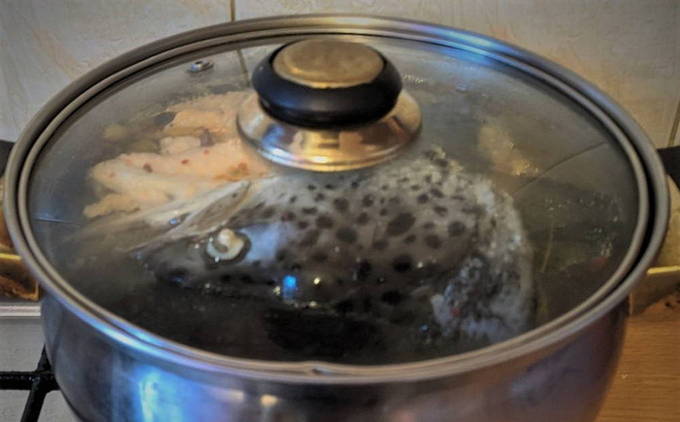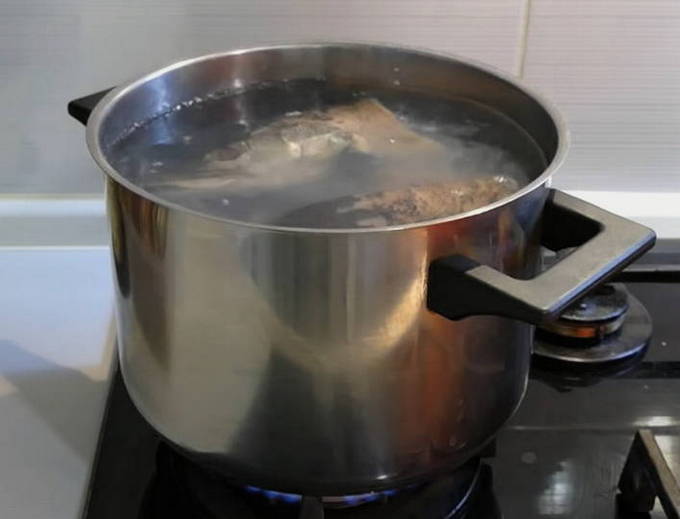 - Spoel de vissenkoppen af, doe ze in een pan en vul met water zodat de pan vol is, maar de kachel niet onderloopt tijdens het koken. Laat koken tot het vlees gaar is.