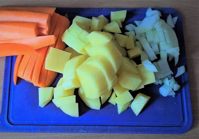 - Snijd de ui fijn, snijd de aardappelen in blokjes en de wortel in blokjes.