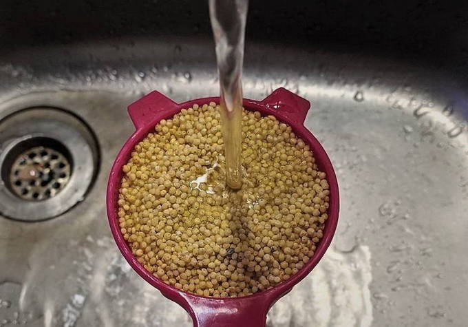 - Laten we verder gaan met gierst. We wassen de grutten en laten ze in een zeef op een bord liggen zodat het water kan weglopen.