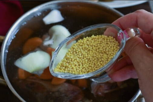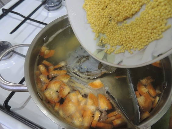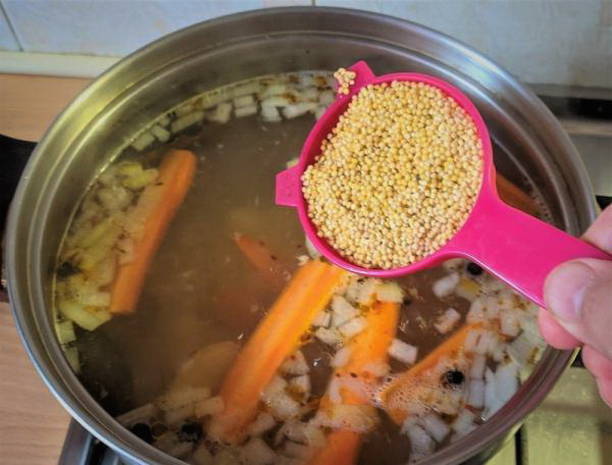 - Zet nu de pot met bouillon op het vuur en voeg gierst en aardappelen toe.