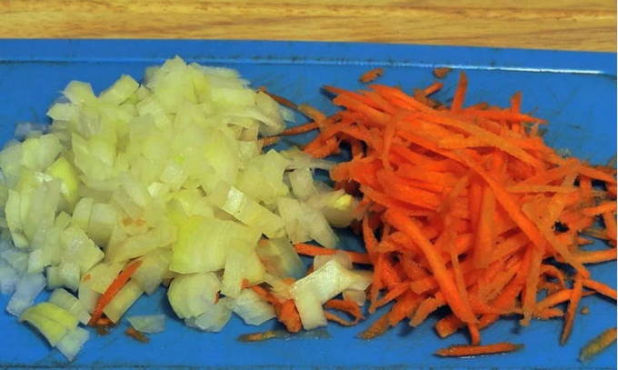 Terwijl de vissenkoppen afkoelen, bereidt u de groenten voor. Wij maken uien, wortelen en aardappelen schoon. Drie wortelen op een grove rasp, en snijd de aardappelen in blokjes. Zet de bouillon weer op het vuur en voeg er groenten en gierst aan toe. Je hoeft de ui niet te hakken, we gooien hem heel. We hebben het alleen nodig om een bepaalde geur en smaak te geven.
