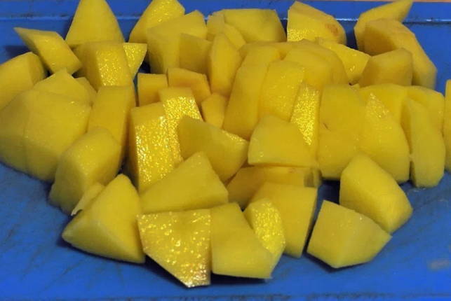 - Snijd de aardappelen in middelgrote blokjes.