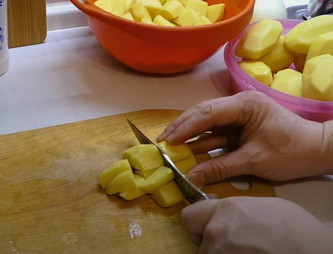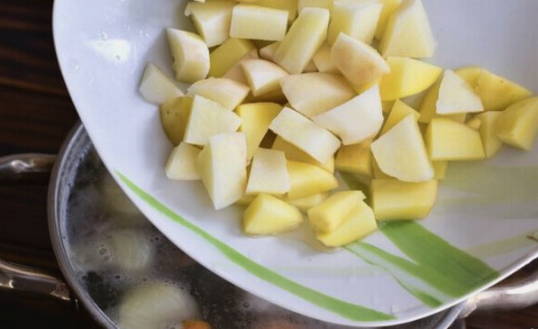 - Snijd de aardappelen in middelgrote blokjes en stuur ze naar het oor. Kook nog 20 minuten.