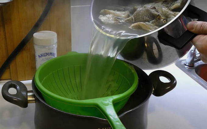 - Nadat de snoek klaar is, moet je de bouillon afgieten. Neem hiervoor een tweede pan en giet het oor erin door een zeef.