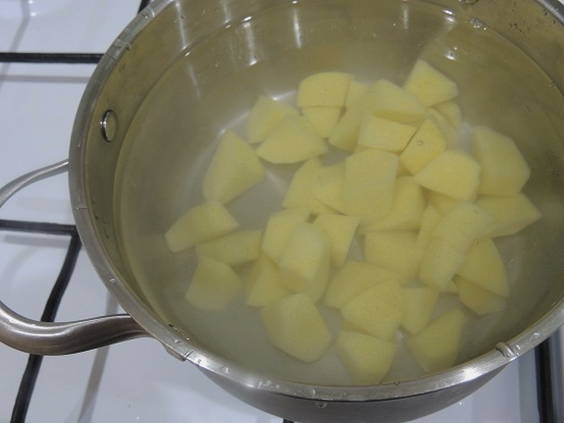 - Snijd de aardappelen in stukjes van willekeurige vorm. Breng over naar een pan met water en laat sudderen op middelhoog vuur.