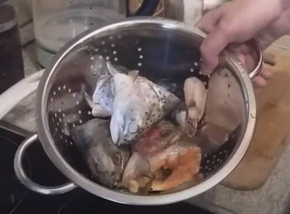 - Spoel de vissenkoppen af, doe ze in een pan en vul met water zodat de pan vol is, maar de kachel niet onderloopt tijdens het koken. Laat koken tot het vlees gaar is.