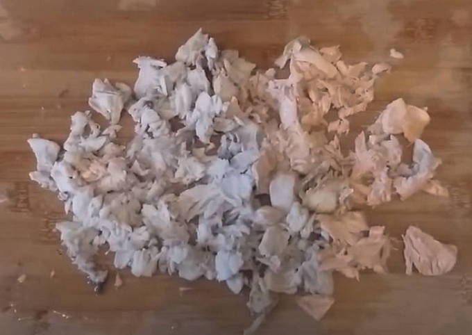 We scheiden het vlees van de gekookte koppen en sturen het ook naar een bijna klaar oor. We halen de kop van de ui eruit en gooien deze weg. We zullen het niet meer nodig hebben.