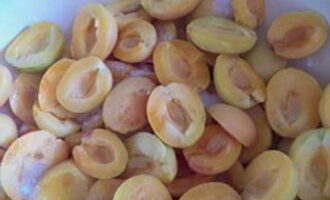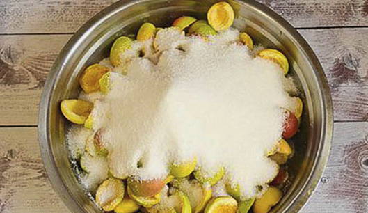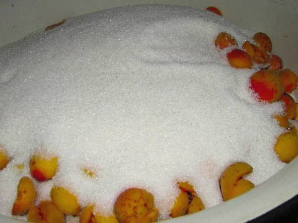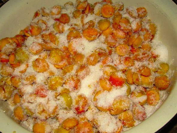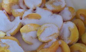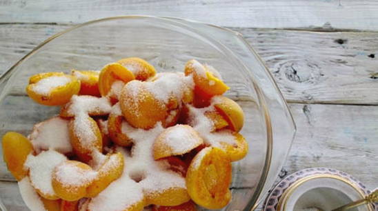 - Was de abrikozen, droog ze, halveer ze en verwijder de zaadjes. Doe de abrikozen in een geëmailleerde kom en bedek ze met suiker, laat de bessen een paar uur staan.