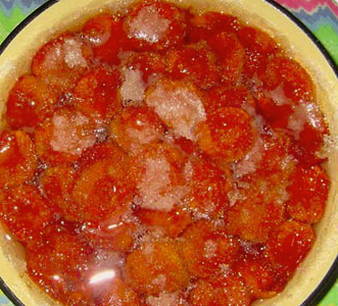 Bedek de vruchten met suiker en meng voorzichtig, laat een dag staan om het sap te laten opvallen.