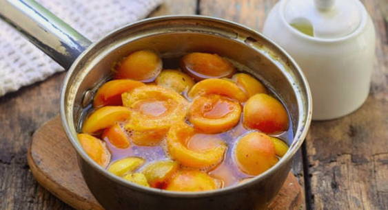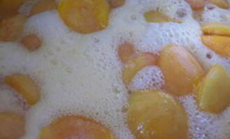 - Doe de abrikozenhelften in de siroop, zet de pan op het vuur, breng de jam aan de kook, kook 5 minuten en zet het vuur uit. Koel de jam een beetje.