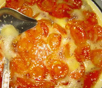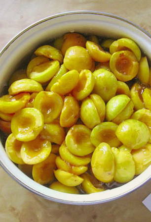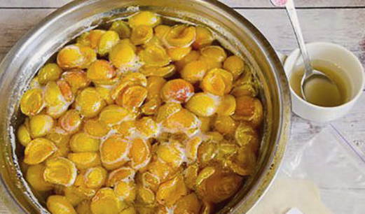 - Giet vervolgens de siroop in een pan, breng aan de kook en laat 10 minuten sudderen. Schenk de siroop opnieuw over de abrikozen en laat een half uur staan. Herhaal deze procedure nog twee keer.