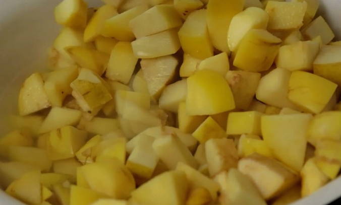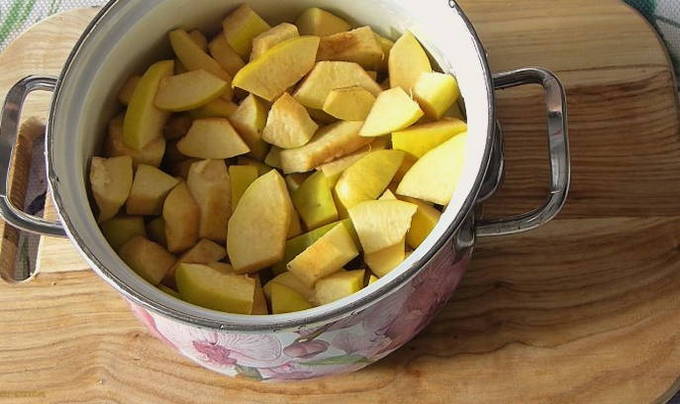 - Doe de kleine kweepeer in een hele pan en hak de grote, waarbij je het vruchtvlees scheidt. We doen alles in een pan.