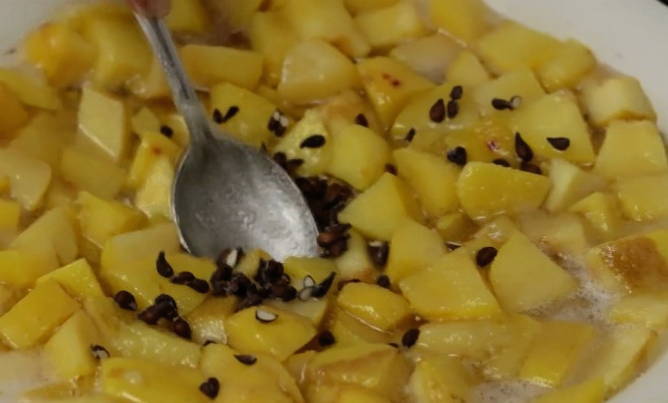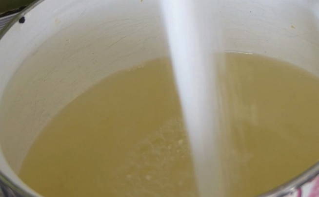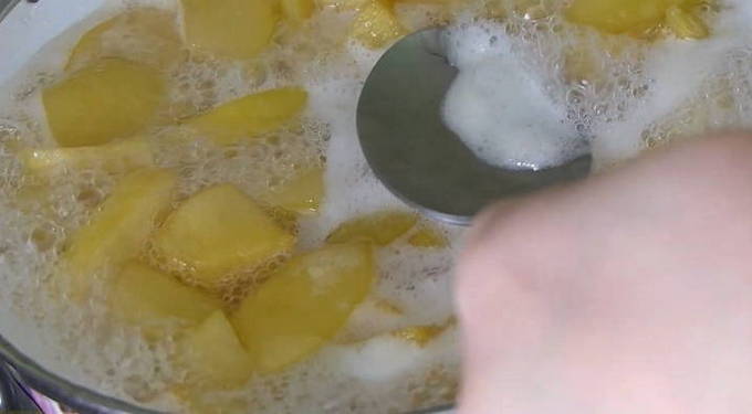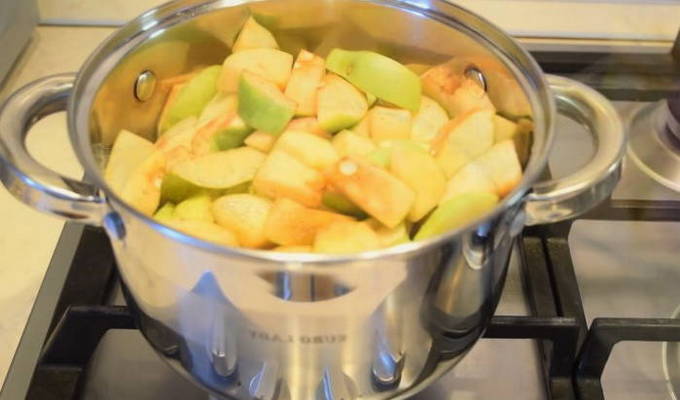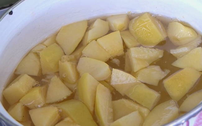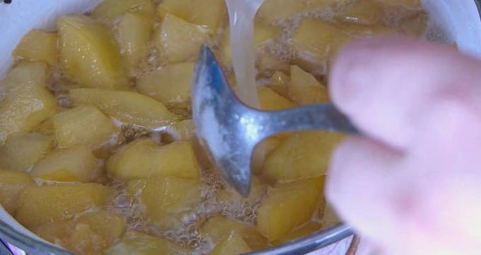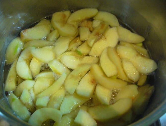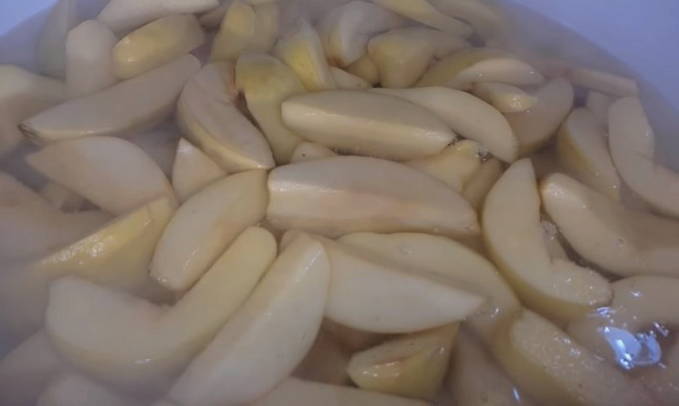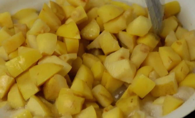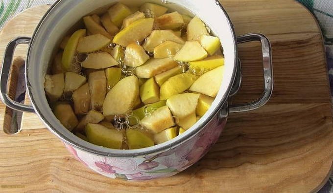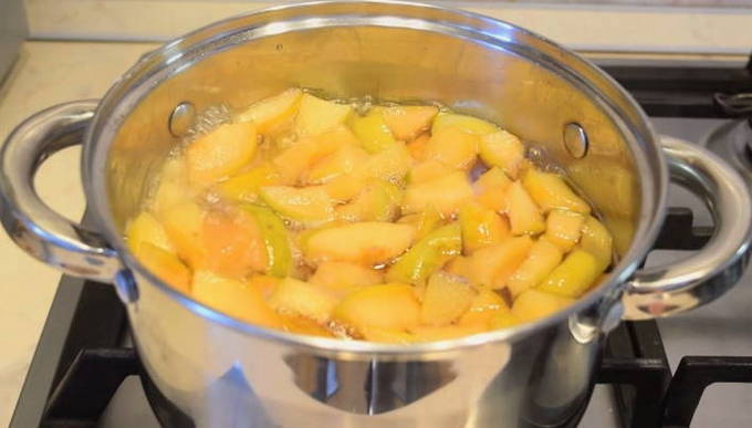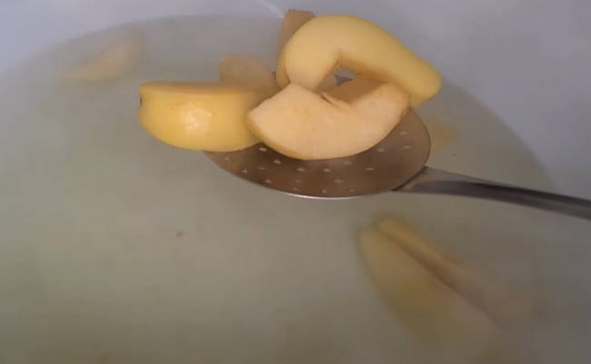 - Doe alle gesneden kweepeer in kokend water, meng voorzichtig en breng aan de kook. Haal de kweepeer vervolgens van het vuur en dek af met een handdoek gedurende 10-12 uur.