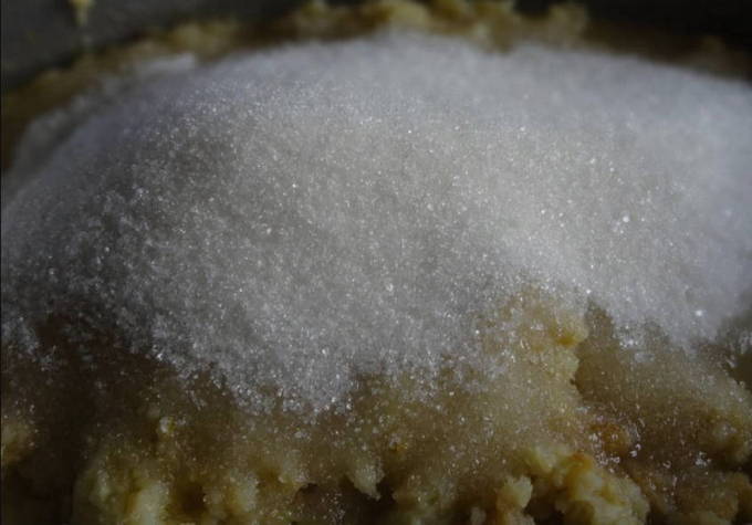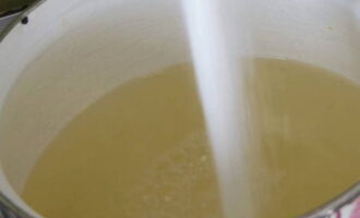 We halen de kweepeerplakken uit de pan en gieten kristalsuiker in kokend water. Meng alles goed en kook tot de kristalsuiker volledig is opgelost.