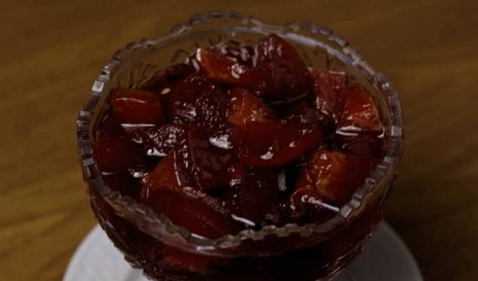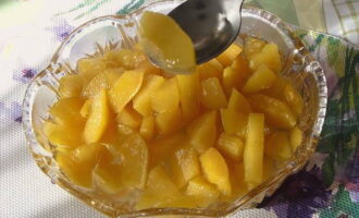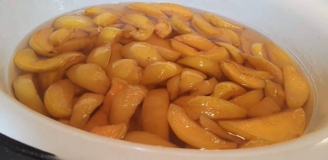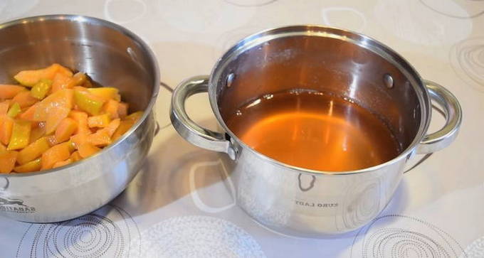 - Breng het fruit letterlijk na 10 minuten terug in de kokende suikersiroop en laat het 3 uur staan. Daarna koken we ze 10 minuten en laten ze 8-9 uur staan.