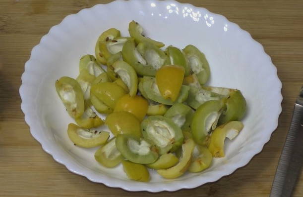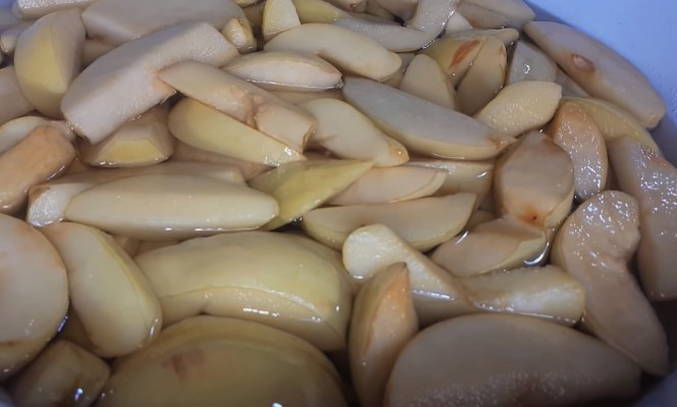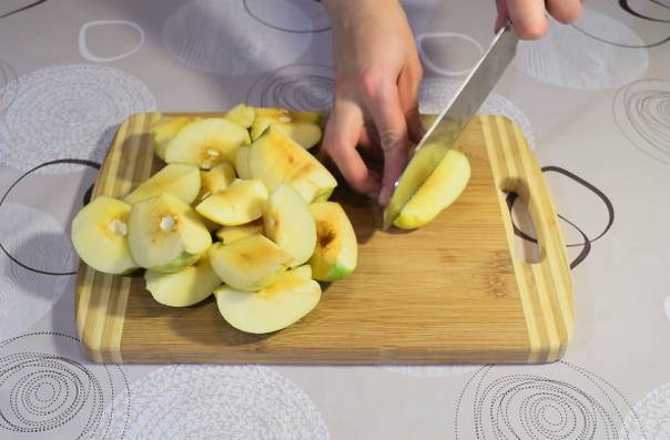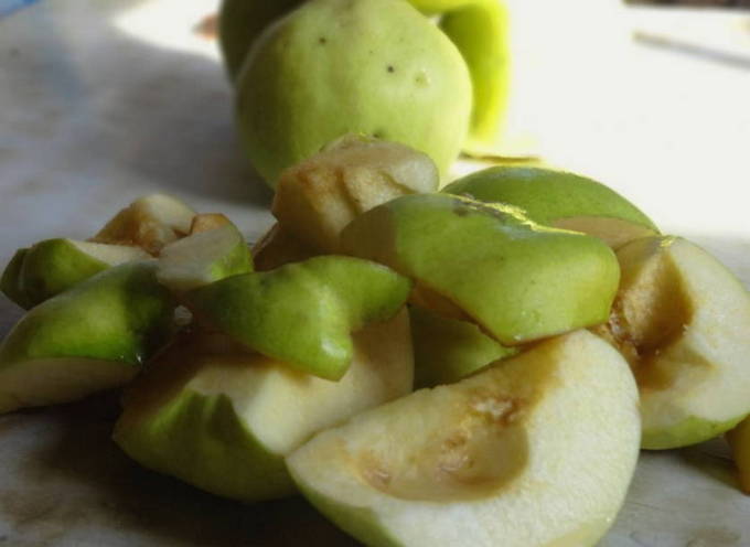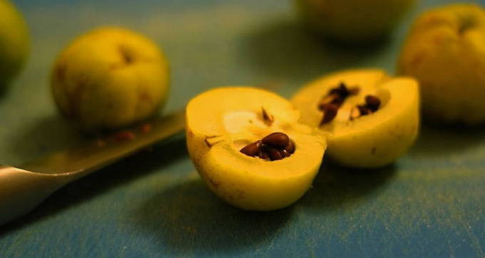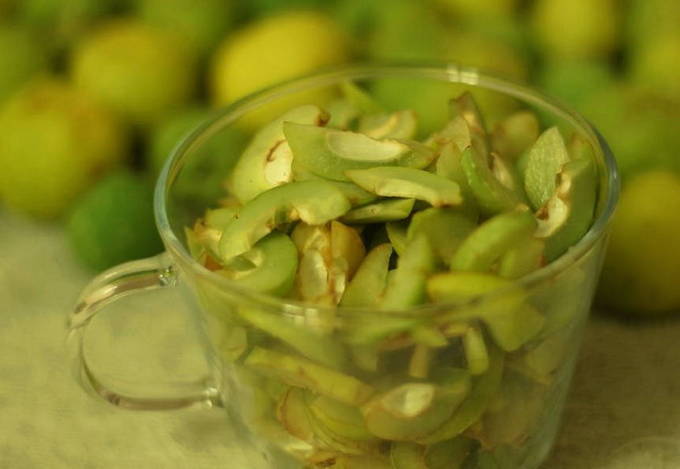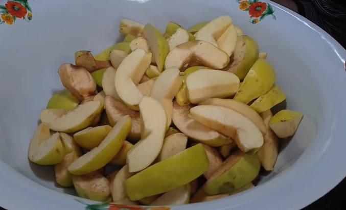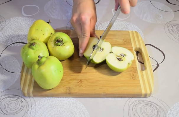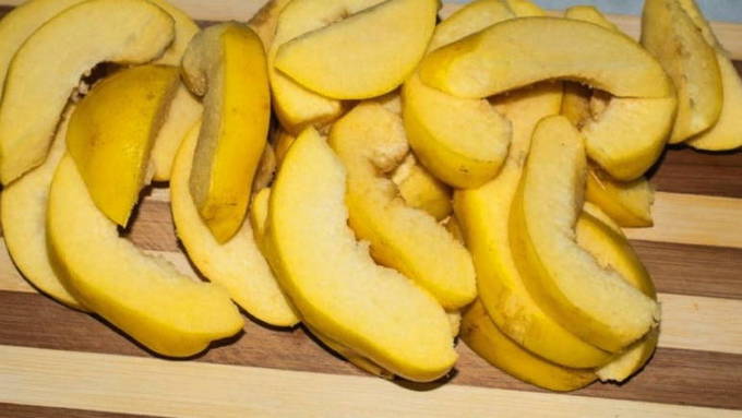 - We wassen de geoogste kweepeer, snijden hem in verschillende plakjes en verwijderen alle zaden.