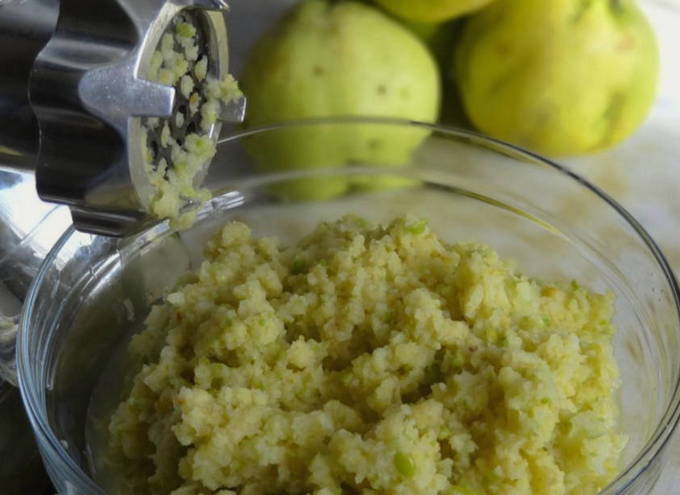 - We wassen de vruchten van rijpe kweepeer, schillen en hakken zo klein mogelijk.