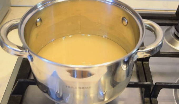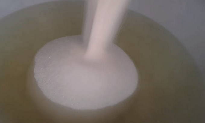 - Giet suiker in hetzelfde hete water, meng en kook de suikersiroop tot de suikerkristallen volledig zijn opgelost.