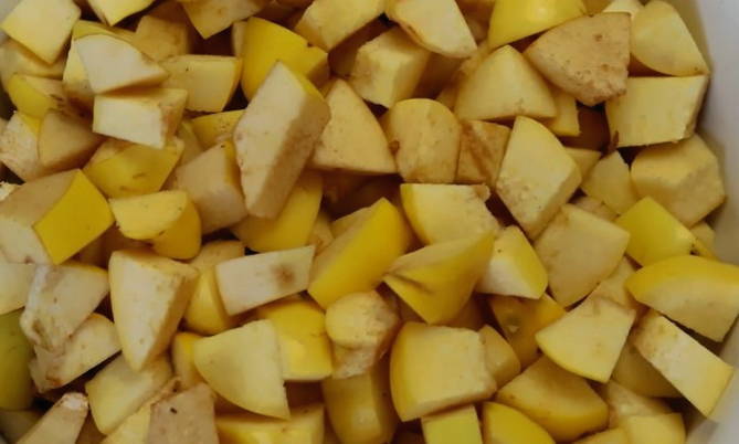 - We wassen de kweepeervruchten, drogen ze en snijden ze in blokjes en doen ze in een bak waarin we de jam zullen koken.