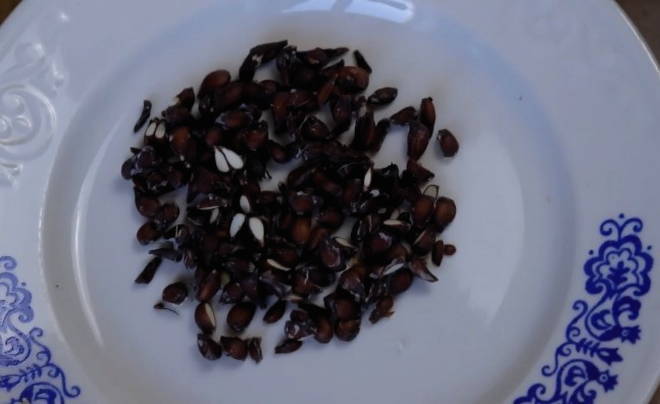 - Leg in dit geval de zaden uit de kern op een bord en droog ze af. We hebben ze nodig voor de volgende stappen om de gelei een speciale consistentie en smaak te geven.