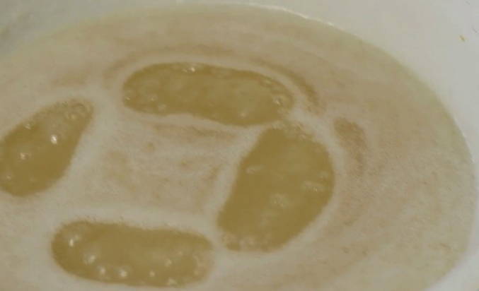 - Daarna laten we het water van de kweepeer in een andere bak lopen en lossen we de kristalsuiker erin op.
