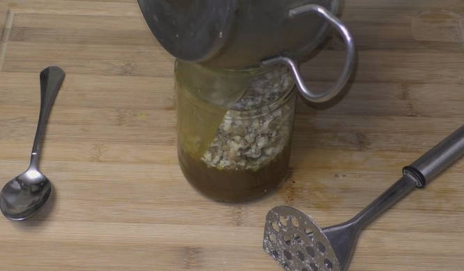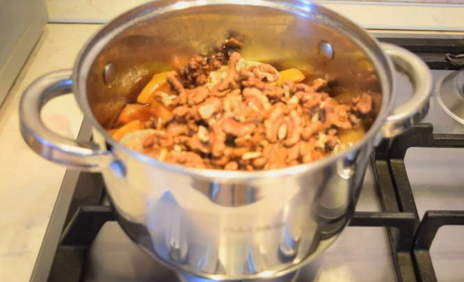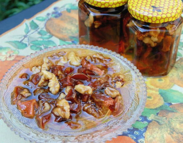 - Daarna sturen we de noten naar een pot met honing en kweepeer, mengen goed en laten drie dagen op kamertemperatuur staan.