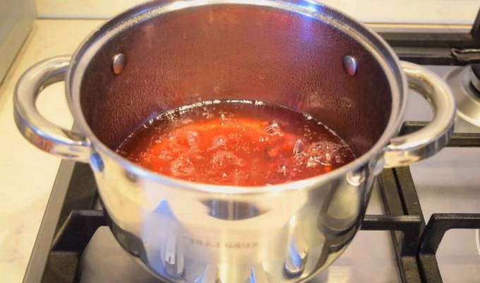 - Om de jam zacht te maken, giet er een beetje schoon water in en meng goed. Daarna koken we de jam ongeveer 30-40 minuten, terwijl we alles van tijd tot tijd roeren.