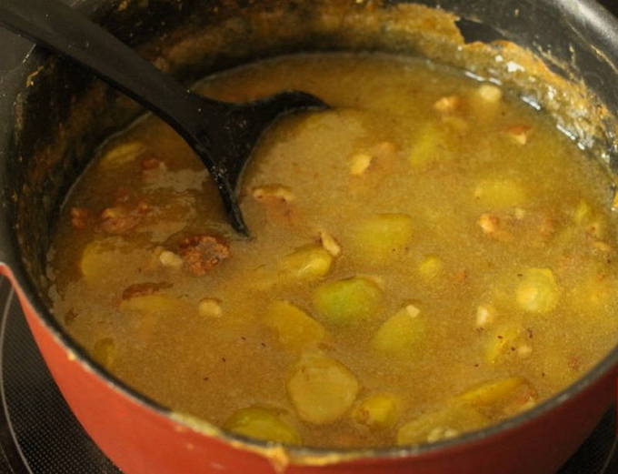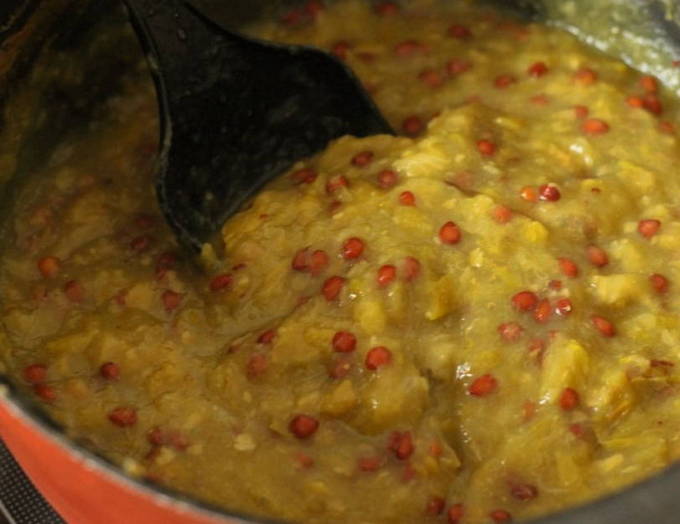 - De volgende dag zetten we de pan met verzachte karamelkweepeer weer op het vuur en brengen het weer aan de kook, af en toe roerend met een spatel.