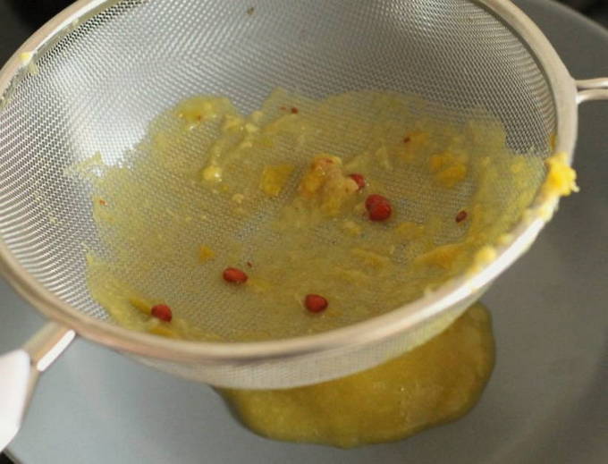 - Passeer de gekookte kweepeer door een zeef om de zaden en de schil te verwijderen.