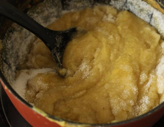 - Giet kristalsuiker en kruiden bij het gescheiden kweeperenpulp, roer goed en kook op laag vuur tot de gewenste consistentie.