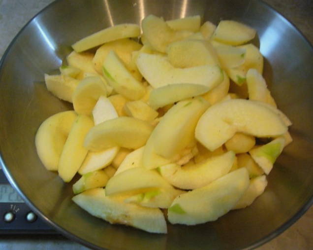 - We wassen de kweepeer, drogen hem en snijden hem samen met de schil in plakjes.