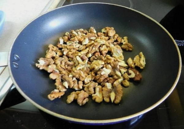 - Bak hele walnotenpitten in een droge koekenpan en voeg toe aan de massa. Meng vervolgens goed en kook de jam tot hij gaar is.