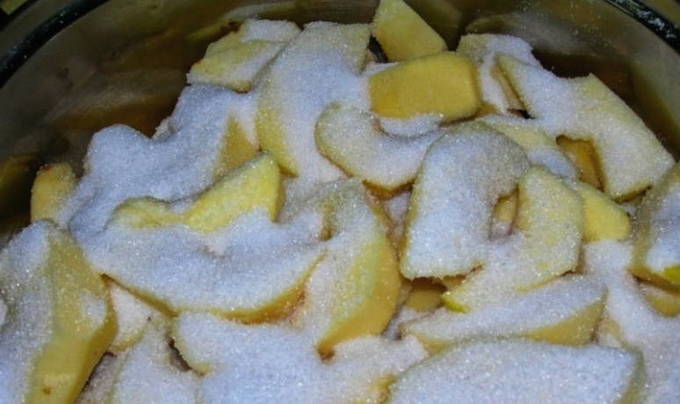 - Vervolgens snijden we de kweepeer willekeurig in plakjes, bedekken het met suiker en laten het 15 minuten in deze vorm staan. Na deze tijd verplaatsen we de kweepeer in kristalsuiker naar het struikgewas van de multicooker en stellen de modus "Stoomkoken" ongeveer 10-15 minuten in.